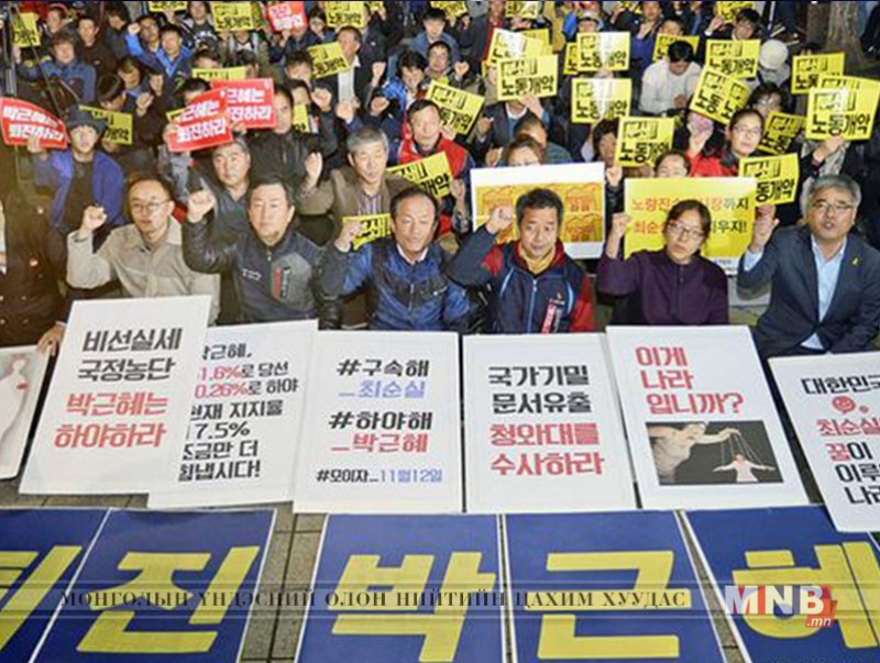 Сөүл хотод 40-өөд мянган хүн оролцсон эсэргүүцлийн жагсаал боллоо. Энэ жагсаалд оролцогчид Ерөнхийлөгч Пак Гын Хэ-г огцрохыг шаардлаа. Энэ бол Ерөнхийлөгчийн нэр хутгалдсан шуугиан ил болсноос хойших хамгийн олон хүний оролцоотой жагсаал юм.