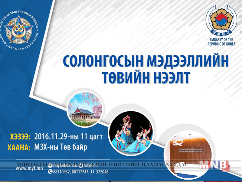 Монголын Залуучуудын Холбоо болон БНСУ-ын ЭСЯ-ны хамтын ажиллагааны хүрээнд" Солонгосын мэдээллийн төв"-ийг байгуулж, маргааш нээлтээ хийх гэж байна. Залуучууд чөлөөт цагаа үр дүнтэй өнгөрөөх, сурч боловсрох таатай орчин нөхцөлөөр хангах зорилготой тус төв нь Монголын Залуучуудын Холбооны төв байрны 2 давхарт байрлах бөгөөд номын сан нь оюутан, залуучуудад тодорхой цагийн хуваарийн дагуу нээлттэй үйлчлэх аж.