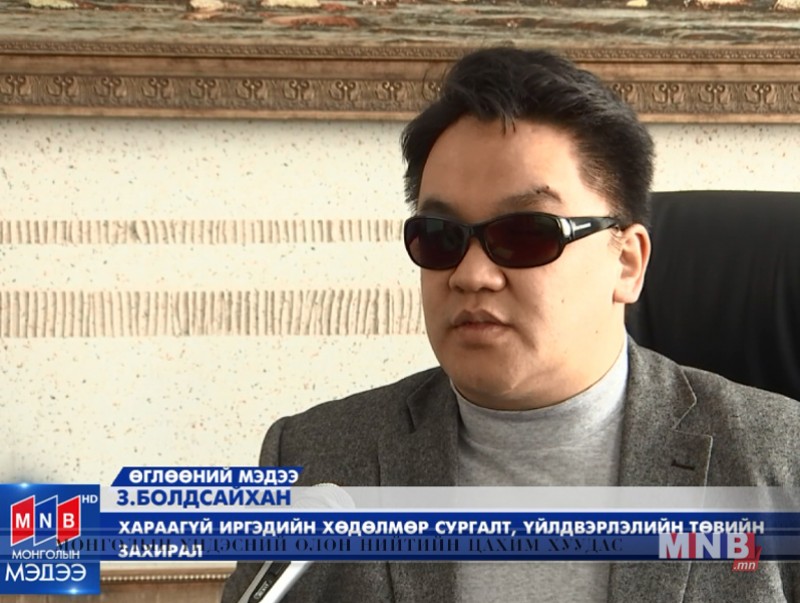 МҮОНРТ-ийн "Монголын мэдээ" телевизийн "Өглөөний мэдээ"-ийн сурвалжлага. Хараагүй иргэдийн хөдөлмөр сургалт, үйлдвэрлэлийн төвийн захирал З.Болдсайхан: Харааны бэрхшээлтэй иргэдэд зориулалтын орчин нөхцөл, ажлын байр шаардлагатай байна.