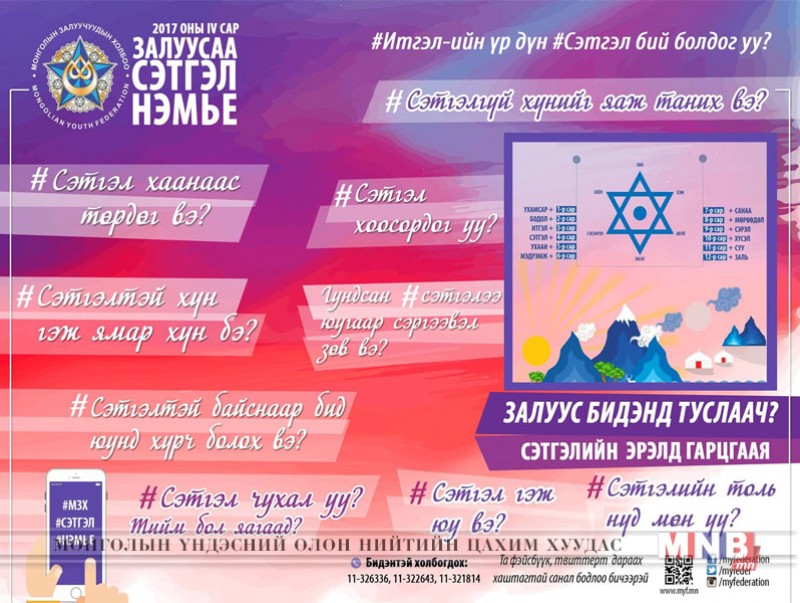 МЗХ энэ онд “Залуусаа Нэмье” уриан доор нэгдэж, сар бүр тодорхой уриалга дэвшүүлэн хэлэлцүүлэг өрнүүлж байгаа билээ. Өнгөрсөн гуравдугаар сард залуус итгэл гэж юу вэ, итгэлтэй хүн гэж ямар хүнийг хэлэх вэ, хүн өөртөө итгэлтэй байснаар юунд хүрч болох вэ зэрэг сэдвийн хүрээнд ярилцаж, олон нийтийн сүлжээ болон хэвлэл мэдээллийн хэрэгслээр маш олон залуус санал бодлоо илэрхийлсэн юм.