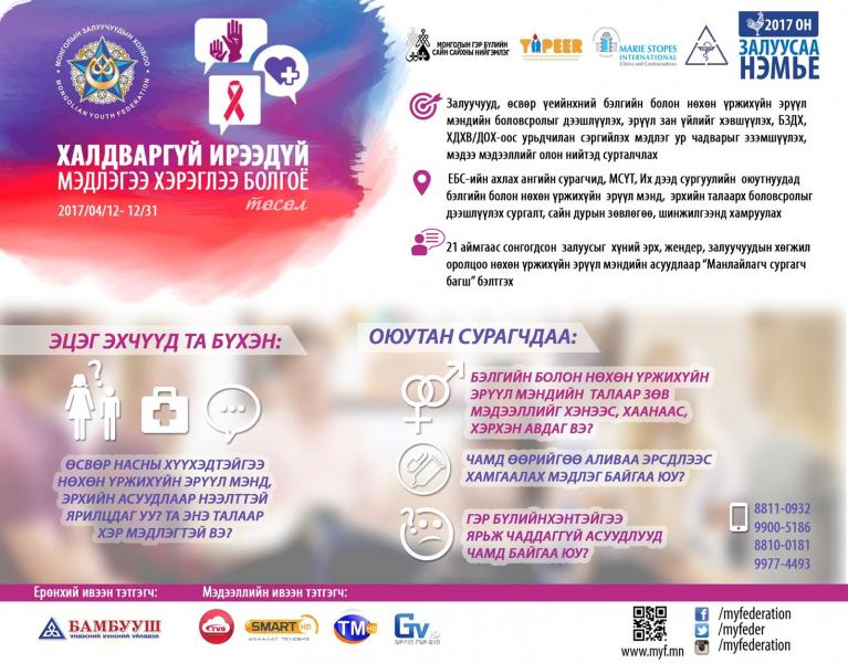 “Халдваргүй Ирээдүй–Мэдлэгээ хэрэглээ болгоё” төслийг 2017 оны дөрөвдүгээр сарын 12-оос 2017 оны 12 дугаар сарын 31-ны хооронд МЗХ-оос санаачлан хэрэгжүүлэхээр боллоо. Төслийг “Монголын Гэр Бүлийн Сайн Сайхны Нийгэмлэг”, “Халдварт Өвчин Судлалын Үндэсний Төв”, “Ү PEER” үе тэнгийн боловсролын үндэсний сүлжээ, “Marie Stopes” Олон улсын байгууллага хамтран хэрэгжүүлэх юм. Төслийн ерөнхий ивээн тэтгэгчээр “Бамбууш” ХХК ажиллаж байгаа юм байна.