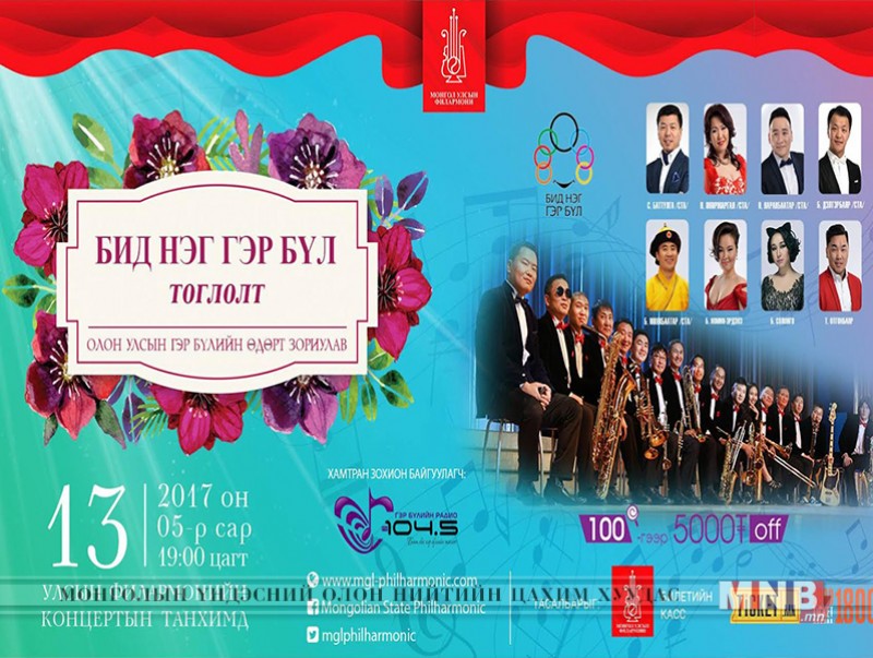 Монгол Улсын Филармониос хэрэгжүүлж буй “Бид нэг гэр бүл” төслийн хүрээнд жил бүр уламжлал болгон зохион байгуулдаг “Бид нэг гэр бүл” тоглолт энэ сарын 13-нд болно.
