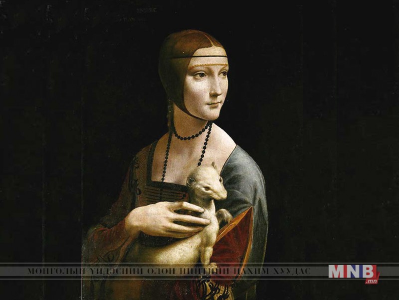 “Булга тэвэрсэн эмэгтэй” хэмээх хөрөг зурганд тэрээр захирагч Людвик Спрукийн дурлалт эмэгтэй Сесилия Галлераниг булга тэврэн ялимгүй зүүн тийш харж буй байдлаар дүрслэн буулгажээ. Тухайн үед бүсгүй 16-17 орчим настай байсан хэмээн түүхэнд тэмдэглэгдсэн байдаг байна. Мөн энэ бүсгүй тухайн үеийн дуучин, жүжигчин мэт гайхалтай авьяаслаг нэгэн байжээ.