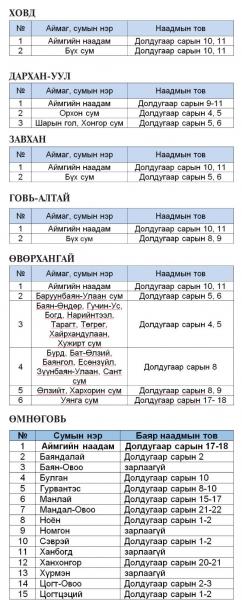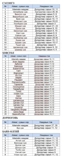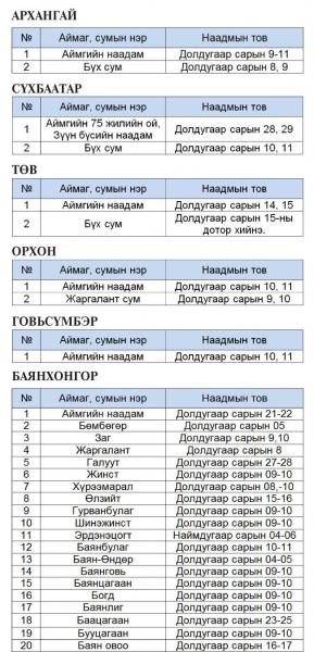 Одоогоор Увс, Дорнод аймаг наадмын товоо эцэслэн гаргаагүй байна. Бусад аймаг, сум баяр наадмаа хэзээ тэмдэглэхээр товлосон тухай мэдллийг хүргэж байна.