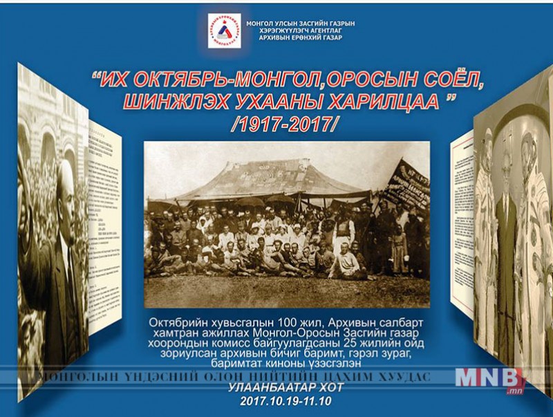 Үүнд зориулж өнөөдөр Архивын ерөнхий газрын үзэсгэлэнгийн танхимд “Их Октябрь - Монгол, Оросын соёл, шинжлэх ухааны харилцаа" /1917-2017/ сэдэвт Монгол Улс, Оросын Холбооны Улсын төрийн архивуудад хадгалагдаж байгаа баримт бичиг, гэрэл зураг, баримтат киноноос бүрдсэн үзэсгэлэн нээлтээ хийна.
