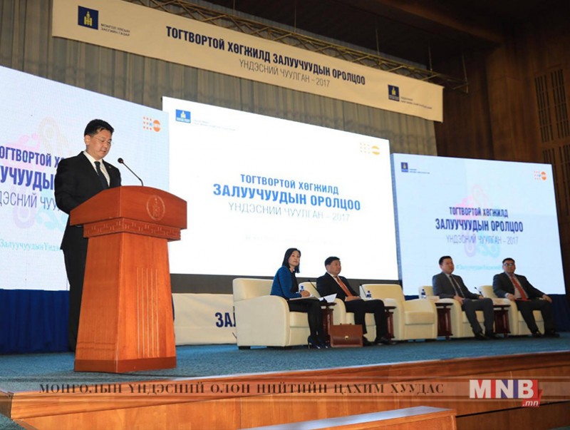 Монгол Улсын Ерөнхий сайдын ивээл дор Хөдөлмөр, нийгмийн хамгааллын яам, Гэр бүл хүүхэд залуучуудын хөгжлийн газар хамтран “Тогтвортой хөгжилд залуучуудын оролцоо” үндэсний чуулганыг 2017 оны 12 дугаар 12-ны өдөр Төрийн ордонд зохион байгуулж байна.