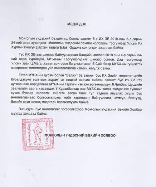 Гэтэл өнөөдөр Монголын Үндэсний бөхийн холбоо буюу өнгөрсөн онд ээлжит бус “Их Эе”-ийг хуралдуулж сонгогдсон төлөөлөгчид мэдээлэл хийж, МҮБХ-ны шинэ удирдлага болох Б.Бат-Эрдэнийг хууль бусаар сонгогдсон гэж үзэв.