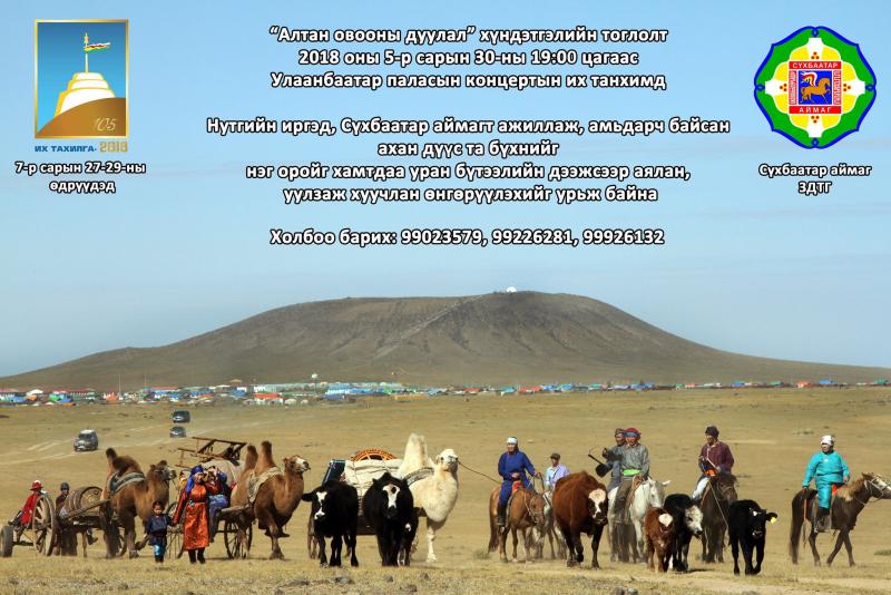 Сүхбаатар аймгийн ЗДТГ, Улаанбаатар хот дахь нутгийн зөвлөл, төрийн их тахилгыг зохион байгуулах комиссын зүгээс нутгийн иргэд, Сүхбаатар аймагт ажиллаж, амьдарч байсан ахан дүүс та бүхнийг нэг оройг хамтдаа уран бүтээлийн дээжсээр аялан, уулзаж хуучлан өнгөрүүлье. Та бүхэн 99023579, 99226281, 99926132 утсуудаар холбогдорой.