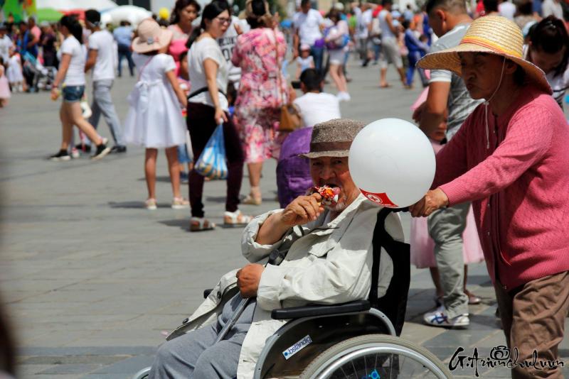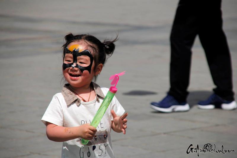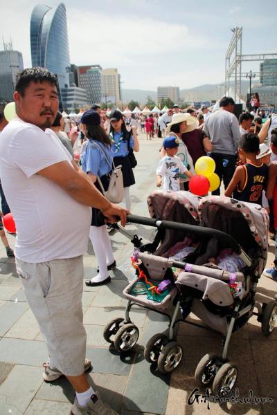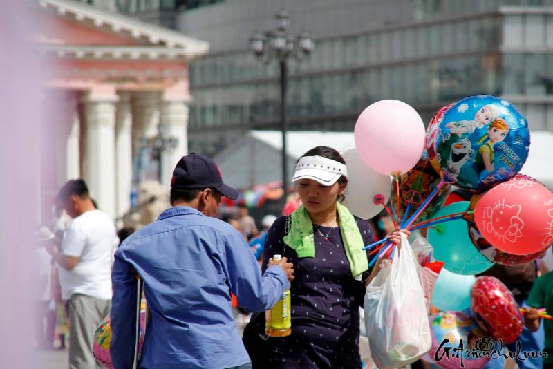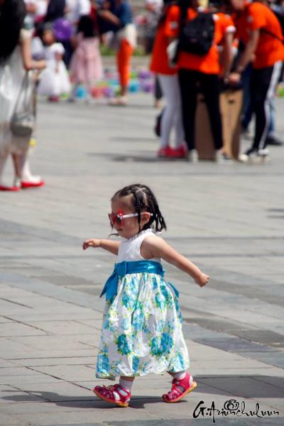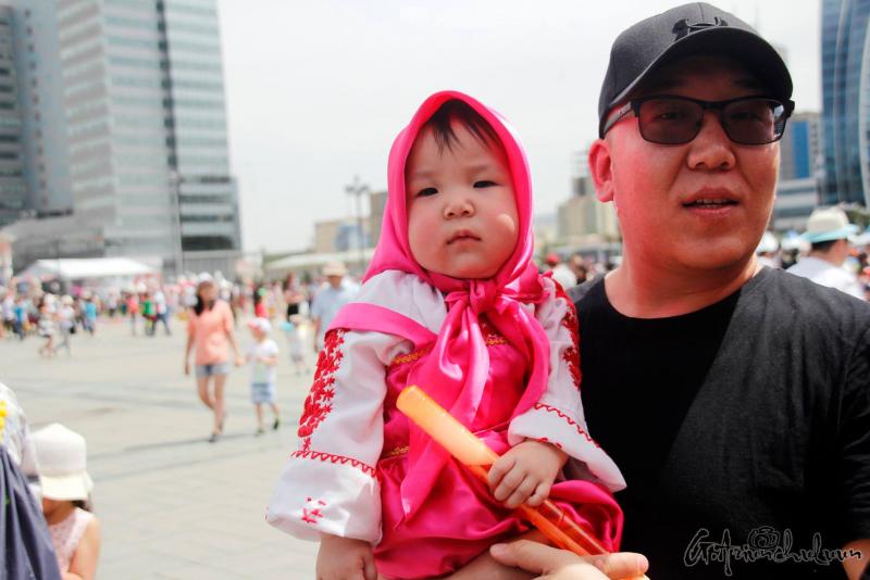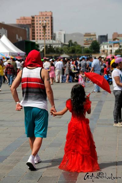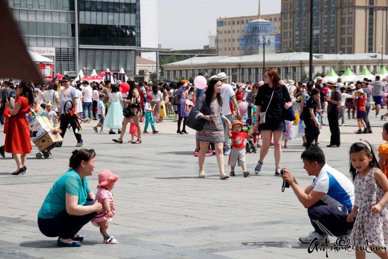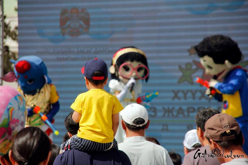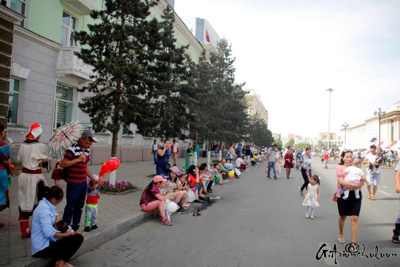 Хүүхдээ хөтөлсөн, тэвэрсэн, тэргэнд суулгаад түрсэн эцэг, эхчүүд хаа сайгүй алхалдана. Мэдээж энд тэндгүй эрээн, чамин тоглоом, бөмбөлөг, туузнууд хийсэх нь баярын өнгийг бүрдүүлж. Зарим хүүхдүүд баярлан ийш тийш гүйлдэх бол зарим нь ээж, аавынхаа гараас чанга хөтлөөд эмээсэн байртай явна. Багачуудын зарим нь унтаж явах бол зарим нь ийш тийш бүлтэлзэж, цөөн хэд нь учир зүггүй чарлаж байна даа.