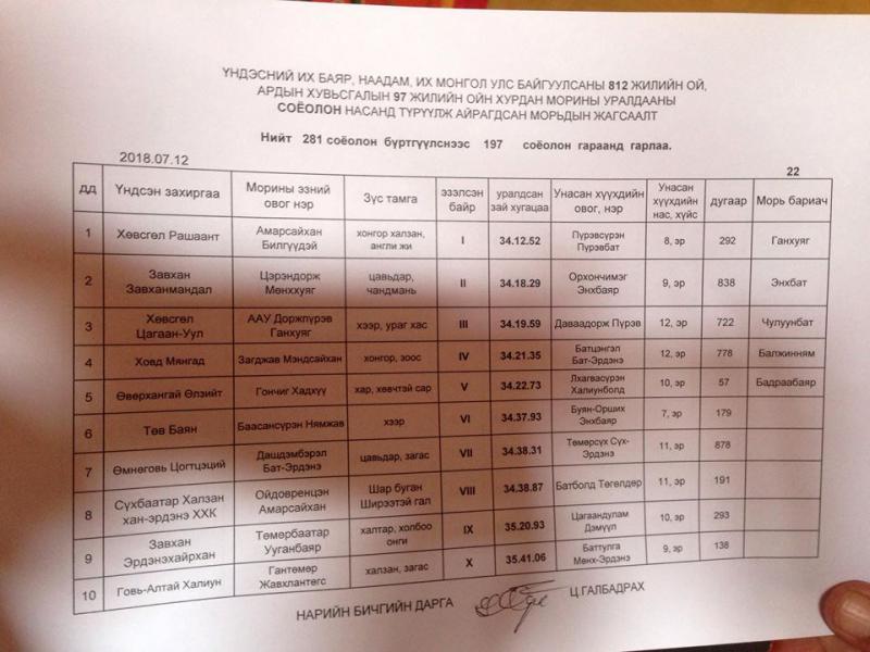 Аман хүзүүнд Завхан аймгийн Завханмандал сумын харьяат уяач Цэрэндоржийн Мөнххуягийн цавьдар, айргийн гуравт Хөвсгөл аймгийн Тариалан сумын уугуул, аймгийн Алдарт уяач Доржпүрэвийн Ганхуягийн хээр, айргийн дөрөвт Ховд аймгийн Мянгад сумын уугуул, уяач Загджавын Мэндсайханы хонгор, Өвөрхангай аймгийн Өлзийт сумын уугуул, уяач Гончигийн Хадхүүгийн хар соёолон давхилаа.