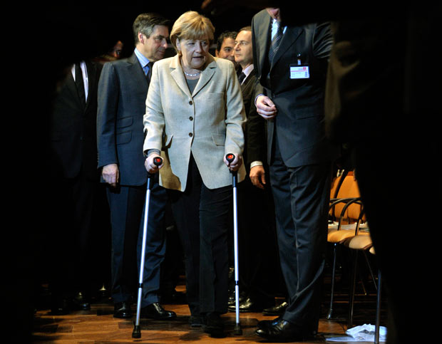 Германы канцлер Ангела Меркель Швейцарийн Санкт Мориц хотын ойролцоо цанаар гулгаж яваад осолдож сүүжний ясаа гэмтээсэн гэж түүний төлөөлөгч Стеффен Сайберт мэдэгдлээ. Түүний хэлснээр канцлер ирэх 3 долоо хоногийн туршид хэвтрийн дэглэм сахих шаардлагатай бөгөөд зарим айлчлалуудыг нь цуцлахаар болсон байна. Осолдох үедээ Меркель хурд багатай явж байсан бөгөөд унасныхаа дараа сүүжний яс нь гэмтсэнийг мэдээгүй ажээ. Гэхдээ дараа нь эмчид үзүүлэх үеэр гэмтлийг нь илрүүлсэн байна. Одоо таягтай алхаж байгаа хатагтай Меркель Лхагва гарагт болох засгийн хуралдааныг даргалах бодолтой байгаа гэнэ. Гэхдээ тэрээр ихэнхдээ гэрээсээ ажил хэргээ явуулах юм байна. Меркелийг осолдохоос хэдэн өдрийн өмнө Германы алдарт нисгэгч Михайл Шумахер Францад цанаар гулгаж яваад мөн осолдож, тархиндаа хүнд гэмтэл авсан юм.