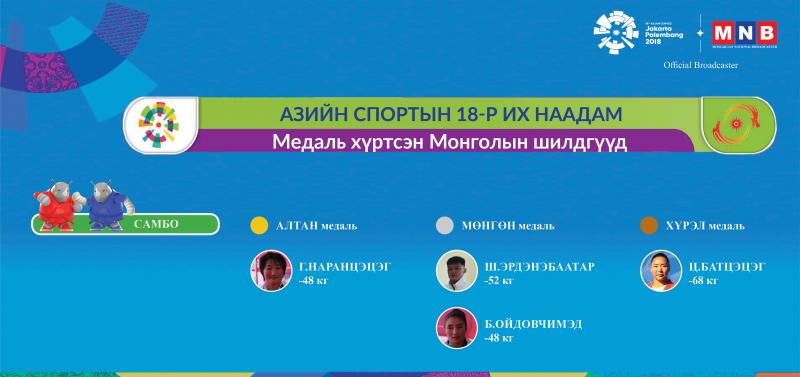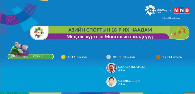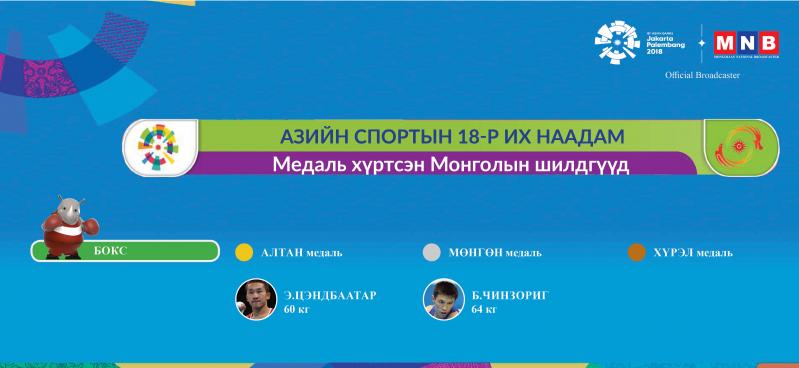 Азийн спортын 18-р наадам Индонезийн Жакарта, Палембанг хотуудад энэ оны наймдугаар сарын 18-ны өдрөөс эхлэн зохион байгуулагдаад, өнөөдөр хаалтын үйл ажиллагаа нь болох гэж байна. Тус наадамд манай улс энэ удаад спортын 30 төрөлд 269 тамирчин оролцож, 5 алт, 9 мөнгө, 11 хүрэл, нийт 25 медаль хүртлээ.