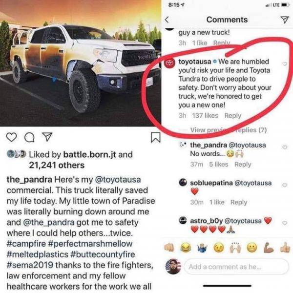 Түүнчлэн тэрбээр машиныхаа тусламжтай түймэрт өртсөн эмнэлгээс хоёр удаа хүмүүсийг аюулгүй газар тээвэрлэжээ. Ийн амьд гарсандаа баярласан залуу “Toyota Tundra” маркийн автомашинаа “магтсан” пост өөрийн инстаграмм хуудсандаа байршуулсан байна. Харин түүний энэ мэдээллийг уншсан “Toyota” корпорацынхан түүнд шинэ “Toyota Tundra” бэлэглэхээр болжээ.