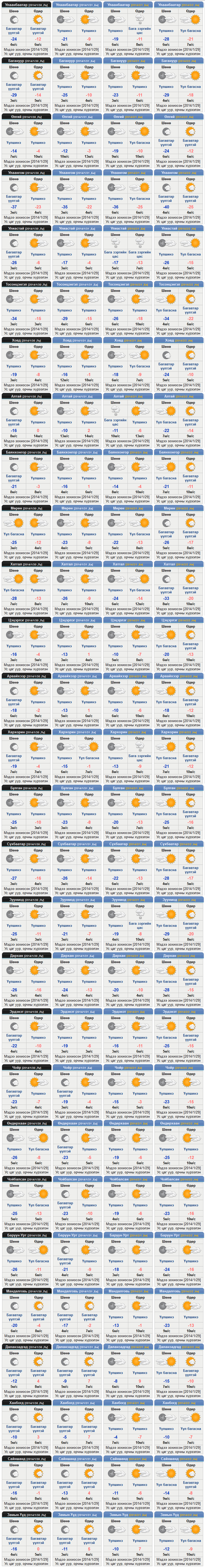 ТӨВИЙН АЙМГУУДЫН НУТГААР:Шөнөдөө багавтар үүлтэй, өдөртөө үүлшинэ. Цас орохгүй. Салхи шөнөдөө баруун хойноос, өдөртөө зүүн өмнөөс секундэд 4-9 метр, өдөртөө нутгийн баруун хэсгээр секундэд 12-14 метр хүрч ширүүснэ. Дархадын хотгороор шөнөдөө 31-36 хэм, өдөртөө 20-25 хэм, Орхон, Сэлэнгэ, Хараа, Ерөө, Туул, Тэрэлж голын сав газраар шөнөдөө 25-30 хэм, өдөртөө 11-16 хэм, бусад нутгаар шөнөдөө 20-25 градус, өдөртөө 5-10 хэм хүйтэн байна.