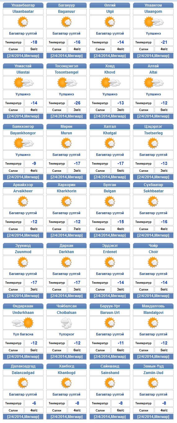 | Өнөөдрийн цаг агаарын мэдээ /2014.02.04/ | ||