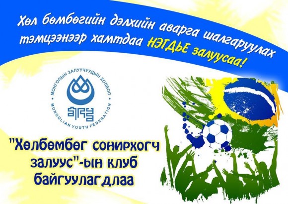 Монголын Залуучуудын Холбоо 2014 оныг “Залуусаа нэгдье” уриан дор бүхий л үйл ажиллагаагаа зохион байгуулж, залуусаа дэмжин, тэднийг чадваржуулах, боловсрол мэдлэгтэй болгох, цагийг үр бүтээлтэй өнгөрүүлж сурах олон ажлуудыг зохион байгуулж байгаагийн нэг нь залуучуудын сонирхлын клубуудыг байгуулах юм байна. 1-р сарын 3-нд залуучууд анхны уулзалтаа хийж 11 төрлийн клуб байгуулан үйл ажиллагаагаа албан ёсоор эхлүүлсэн. МЗХ-ны дэргэдэх клубт залуу дугуйчин, залуу эмэгтэйчүүд, залуу бүжигчин, залуу сэтгүүлч, япон хэл сонирхогчдын клуб, залуу гоо зүйч, залуу наадгайчин, өглөөний хүн, номонд дурлагсдын клуб, Англи хэл сонирхогчдын клуб, Испани хэл сонирхогчдын клуб зэрэг 11 клубын үйл ажиллагааг эхлүүлсэн юм. Тэгвэл өнөөдөр дахин нэг шинэ клуб байгуулагдлаа. Хөл бөмбөгийн дэлхийн аварга шалгаруулах тэмцээнийг угтан “Хөлбөмбөг Сонирхогч Залуус” клуб шинээр байгуулагдаж байгаа бөгөөд өнөөдөр МЗХ-ны “Залуус танхим”-д 18.00 цагаас анхныхаа уулзалтыг зохион байгуулахаар болжээ. “Хөлбөмбөг Сонирхогч Залуус” клуб нь Монголын Залуучуудын Холбооны өнгөрсөн оноос хэрэгжүүлж эхэлсэн “Спирт үү, Спорт уу “ аяныг дэмжиж сар бүр тогтмол үйл ажиллагаа явуулах зорилготой аж. Хөлбөмбөг сонирхогч залуусын өмнө клубын үүд хаалга нээлттэй гэдгийг дуулгалаа.