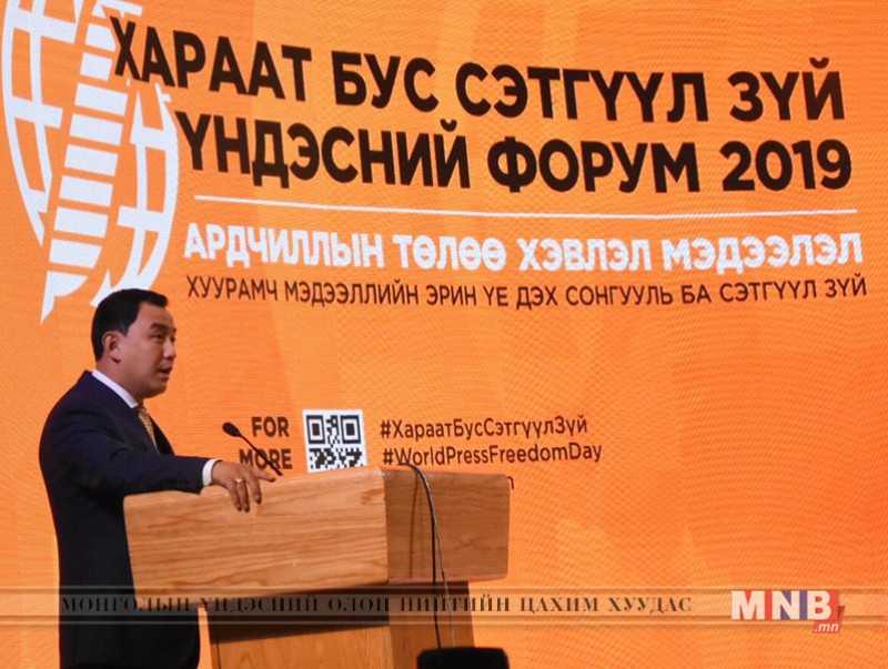 Та бүхэнд Монгол Улсын Ерөнхий сайдын нэрийн өмнөөс болон хувиасаа Дэлхийн хэвлэлийн эрх чөлөөний өдрийн халуун мэндчилгээ дэвшүүлье.Өнөөдөр та бүхэн үндэсний сэтгүүлзүйн 106 жилийн түүхээ эргэн харж, хэвлэл мэдээлэл, сэтгүүлзүйн салбарын өнөөдрийн нөхцөл байдлыг шүүн тунгааж, ирээдүйн хөгжлийн бодлогоо тодорхойлохоор “Хараат бус сэтгүүлзүй” Үндэсний форумд хуран цуглараад байна.