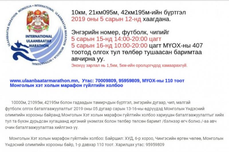 Нийслэлийн Засаг даргын Тамгын газар, нийслэлийн Биеийн тамир, спортын хорооноос зохион байгуулж байгаа “Улаанбаатар марафон-2019” олон улсын гүйлтийн тэмцээн Д.Сүхбаатарын талбайд энэ сарын 18-нд болно.
