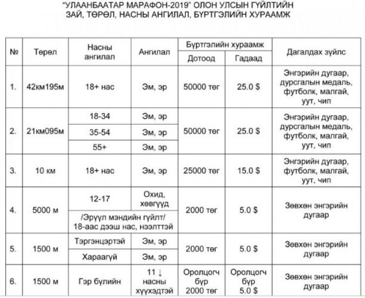 Уламжлалт гүйлтийн тэмцээн өсвөр үе, залуучууд, насанд хүрэгчид болон гэр бүл, тэргэнцэртэй иргэдийн дунд болох бөгөөд бүртгэлийг http://ub-marathon.ub.gov.mn/ сайтаар авч байна.