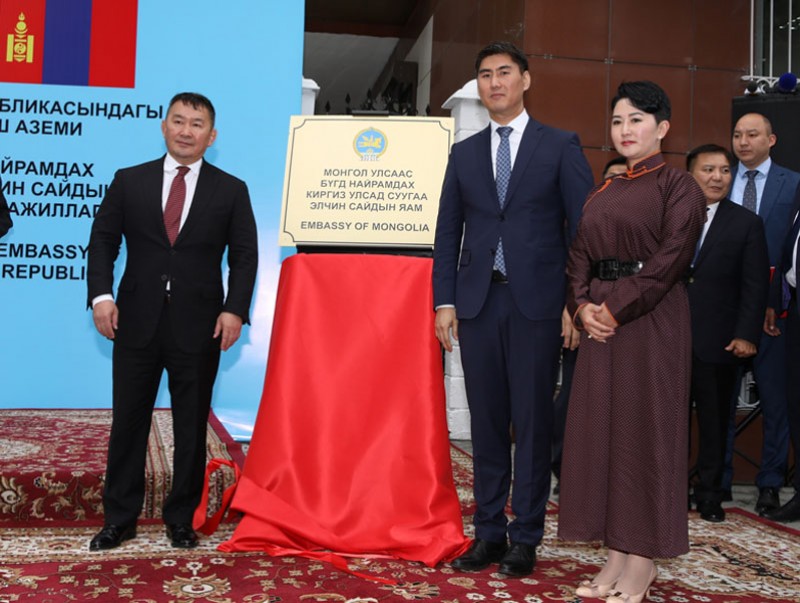 Монгол Улсын Ерөнхийлөгч Х.Баттулга үг хэлснийхээ дараа Гадаад харилцааны дэд сайд Б.Батцэцэг, Бүгд Найрамдах Киргиз улсын Гадаад хэргийн сайд Ч.А.Айдарбеков нарын хамтаар Монгол Улсаас Бүгд Найрамдах Киргиз Улсад суух Элчин сайдын яамны хаяг, самбарыг байрлууллаа.