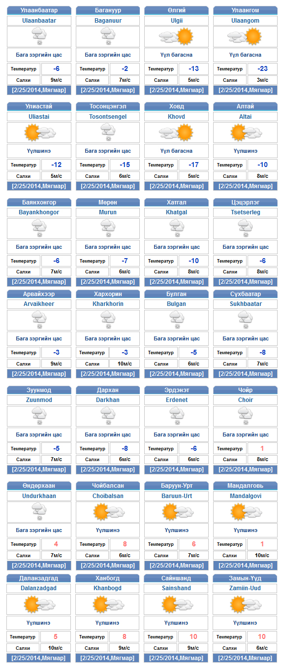 Өнөөдөр ихэнх нутгаар, 26-нд нутгийн зүүн хагаст цас орж, цасан шуурга шуурч хүйтрэхийг онцгойлон анхааруулж байна. Ихэнх нутгаар үүлэрхэг. Нутгийн төв хэсгээр цас орж, цасан шуурга шуурна. Бусад нутгаар цас орохгүй. Салхи нутгийн зүүн өмнөд хэсгээр баруун өмнөөс, бусад нутгаар хойноос секундэд 7-12 метр, нутгийн өмнөд хэсгээр түр зуур секундэд 16-18 метр хүрч ширүүснэ. Ихэнх нутгаар хүйтэрч Их нууруудын болон Дархадын хотгор, Идэр, Тэс голын сав газраар 17-22 хэм, Сэлэнгэ, Хараа, Ерөө, Туул, Тэрэлж голын сав газраар 7-12 хэм хүйтэн, говь талын 4-9 хэм дулаан, бусад нутгаар 4-9 хэм хүйтэн байна.