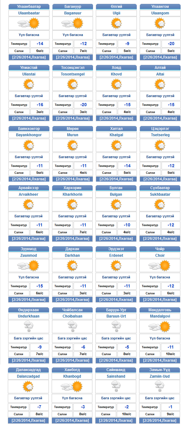 Өнөөдөр зүүн зүгийн нутгаар цас орж, цасан шуурга шуурч, бүх нутгаар хүйтрэхийг онцгойлон анхааруулж байна. Зүүн зүгийн нутаг болон говийн нутгийн зүүн хэсгээр үүлэрхэг. Цас орж, цасан шуурга шуурна. Бусад нутгаар багавтар үүлтэй. Цас орохгүй. Салхи баруун хойноос секундэд 5-10 метр, говь болон зүүн зүгийн нутгийн зарим газраар түр зуур секундэд 16-18 метр хүрч ширүүснэ. Хүйтэрч Их нууруудын болон Дархадын хотгор, Идэр, Тэс голын сав газраар 16-21 хэм, Сэлэнгэ, Ерөө, Туул, Тэрэлж голын сав газраар 12-17 хэм, говийн бүс нутгийн өмнөд хэсгээр 1-6 хэм, бусад нутгаар 8-13 хэм хүйтэн байна.