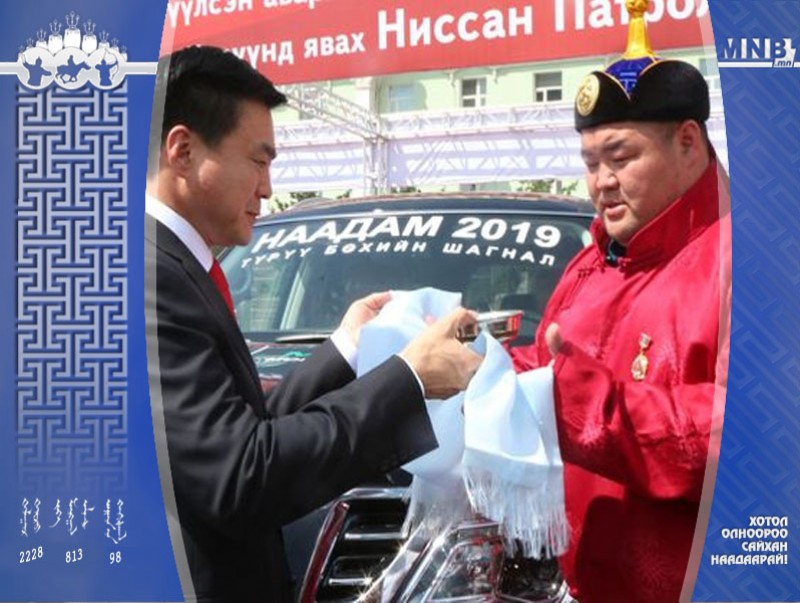 Тулгар төрийн 2228, Их Монгол Улсын 813, Ардын хувьсгалын 98 жилийн ой, Үндэсний их баяр наадмын хүчит 512 бөхийн барилдаанд ес даван түрүүлсэн Монгол Улсын аварга Э.Оюунболдод “Моннис Моторс" компани “Nissan patrol Y62” автомашин бэлэглэсэн билээ.