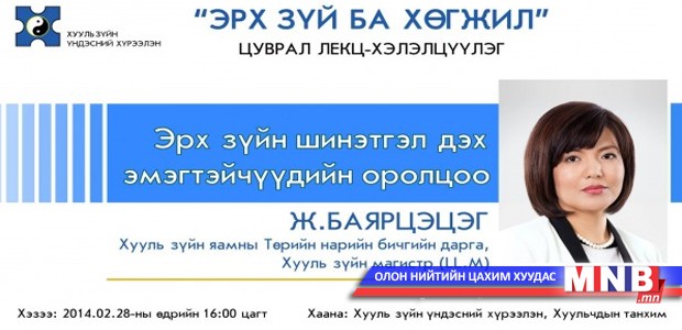 Энэхүү цуврал лекцийн анхны зочноор Хууль зүйн яамны төрийн нарийн бичгийн дарга, хууль зүйн магистр Ж.Баярцэцэг оролцож, “Эрх зүйн шинэтгэл дэх эмэгтэйчүүдийн оролцоо” сэдэвт лекцээ уншихаар болжээ.