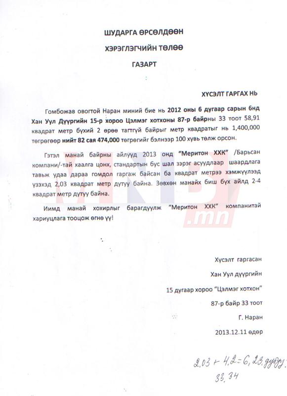 -Тэгээд бид цахилгааны мөнгө хураадаг хүнтэйгээ учраа олохоор уулзсан юм. Гэтэл тэр хүн “Меритон” компанийн хүмүүс хил гараад явчихсан. Бидний цалинг ч өгөөгүй. Би одоо сайн дураараа мөнгө хурааж “Туул өргөө” компанид тушааж байна гэж хэлсэн. Тэгээд бид ер нь метр квадратаа шалгуулсан нь зөв байх гээд шалгуултал нэг айлаас 2-4 метр дутсан юм. “1111” төвд хандаж үзлээ. Гэтэл “Шударга өрсөлдөөн хэрэглэгчийн төлөө газар”-т хандана уу гэж зөвлөсөн. Ингээд бид “Шударга өрсөлдөөн хэрэглэгчийн төлөө газар”-т албан ёсоор хандаж, байцаагч Ж.Мөнхсайханд хүсэлтээ хүргүүлсэн. Гэтэл тэр хүн одоо хүртэл бидний тэр бичгийг олохгүй байна гээд байгаа. Үүнд ч гэсэн бид гомдолтой байна.