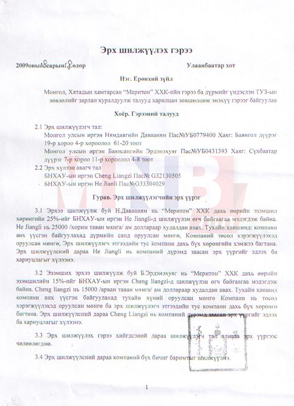 “Меритон” ХХК-ийг Cheng Liangzi, He jianli гэх хүмүүст шилжүүлсэн...