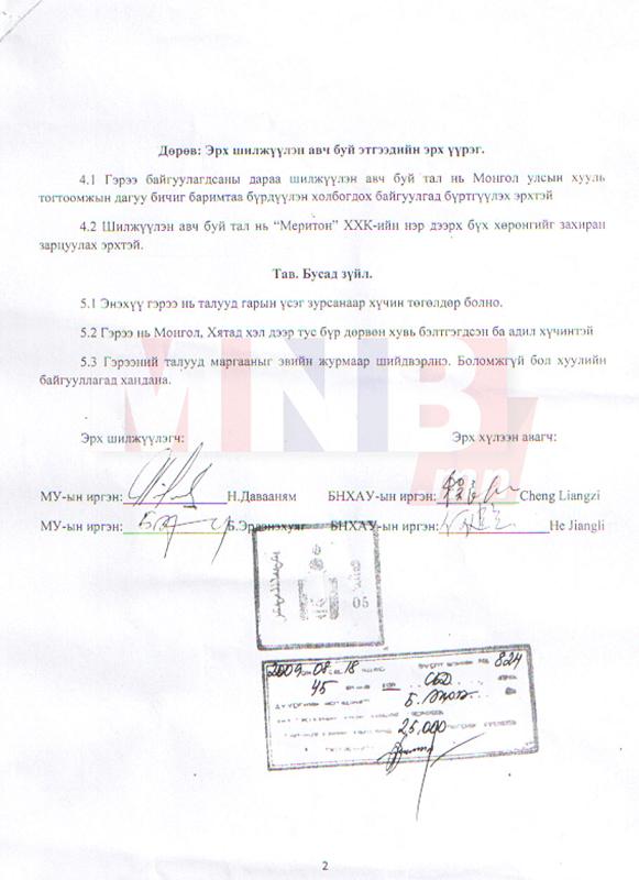 -Би тухайн үед 2009 онд энэ “Меритон” ХХК-ийн тамга, тэмдэг зэрэг холбогдох бүхий л бичиг баримтыг Хятадын иргэн Cheng Liangzi, He jianli гэх хөрөнгө оруулагч хүмүүст шилжүүлсэн. Учир нь “Меритон” компанийн хөрөнгө оруулалтын 40 хувийг би, 60 хувийг тэр хоёр гаргасан юм.