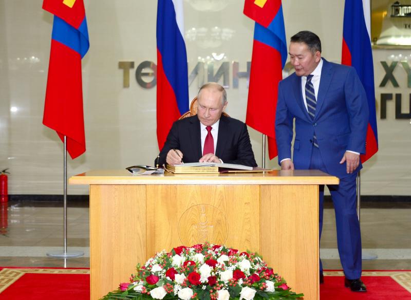 Монгол Улсын Ерөнхийлөгч Х.Баттулгын урилгаар албан ёсны айлчлал хийж буй ОХУ-ын Ерөнхийлөгч В.В.Путин хүндэт зочны дэвтэрт гарын үсгээ зурж, Монгол Улсын Ерөнхийлөгч Х.Баттулгатай дурсгалын зураг татуулсан.