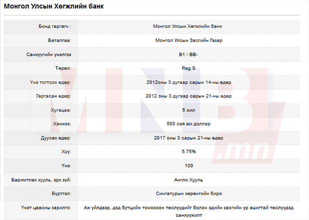 Хөгжлийн банк 2012 оны гуравдугаар сарын 21-нд 580 сая ам.долларын бондыг таван жилийн хугацаатай 5.75 хувийн хүүтэй гаргасан. Энэ бондыг Монгол Улсын Засгийн газрын баталгаатай гаргасан учир Засгийн газрын өрд тооцогдож байгаа. Өөрөөр хэлбэл, “Хөгжлийн банк” бондын төлбөрөө төлж дийлэхгүйд хүрвэл, хариуцлагыг нь Засгийн газар хүлээх юм. Засгийн газрын өрд тооцогдож буй энэ бондын төлбөрийг хийхэд гурван жилийн хугацаа үлджээ. Тодруулбал, хөрөнгө оруулагчдаас авсан 580 сая доллараа 2017 оны гуравдугаар сарын 21-нд буцаан төлөх ёстой юм.