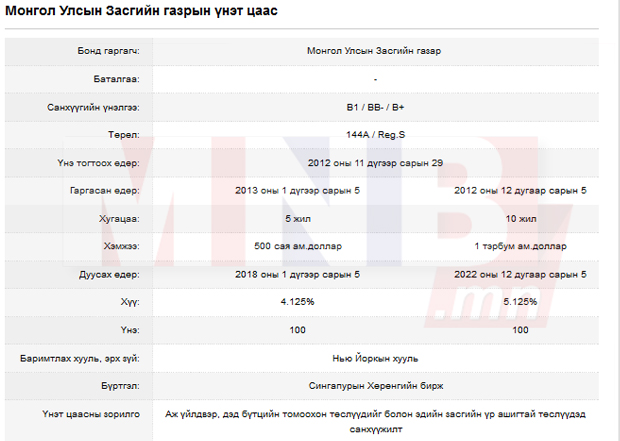 Засгийн газар 2012 оны сүүлч, 2013 оны эхээр түүхэндээ анх удаа өөрийн бондыг дэлхийн зах зээлд гаргаж арилжаалсан. Тодруулбал, 2012 оны арванхоёрдугаар сарын 5-нд нэг тэрбум ам.долларын бондыг арван жилийн хугацаатай 5.125 хувийн хүүтэй гаргасан. Тэгвэл 2013 оны нэгдүгээр сарын 5-нд 500 сая ам.долларын бондыг таван жилийн хугацаатай 4.125 хувийн хүүтэй гаргасан. Чингис хэмээн нэрийдсэн 1.5 тэрбум ам.долларын бондын эргэн төлбөрийг 2018 оноос эхлэн хийнэ. Тухайлбал, 2018 оны нэгдүгээр сарын 5-нд таван жилийн хугацаатай бондын төлбөрийг, 2022 оны арванхоёрдугаар сарын 5-нд 10 жилийн хугацаатай бондын төлбөрөө хийх ёстой.