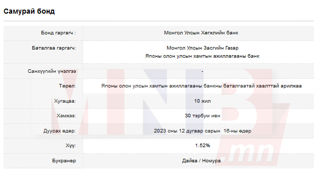 Засгийн газар “Чингис” бондоос босгосон 1.5 тэрбум долларын орлогоо төсөл хөтөлбөрт нь зарцуулж дуусаагүй, хүүгийн төлбөрт орж суугаа. Гэтэл араас нь “Самура” хэмээн нэрийдсэн 30 тэрбум иений бондыг Японы зах зээлд гаргах нь тэр. Бондын орлого 2014 оны нэгдүгээр сарын 6-ны өдөр Хөгжлийн банкны дансанд орж ирсэн. Ингэхдээ Хөгжлийн банкны дансанд ердөө 24 тэрбум 250 сая иен байршсан. Үлдэх 5.7 тэрбумын эрэлд манай сайт гарахад, Японы хамтын ажиллагааны банкны баталгааны төлбөрт суутгуулсан нь тодорхой болсон. Дундаасаа сох дутсан энэ бондын төлбөрийг манай улс 2023 оны арванхоёрдугаар сарын 16-ны өдөр хийх ёстой юм байна. Ингэхдээ бонд худалдаж авсан Японы банкуудад 30 тэрбум иен төлөх ёстой. Монгол Улсын Засгийн газрын дэлхийн зах зээлд гаргасан бондын эргэн төлөлтийн хугацааг сануулахад ийм байна!!!