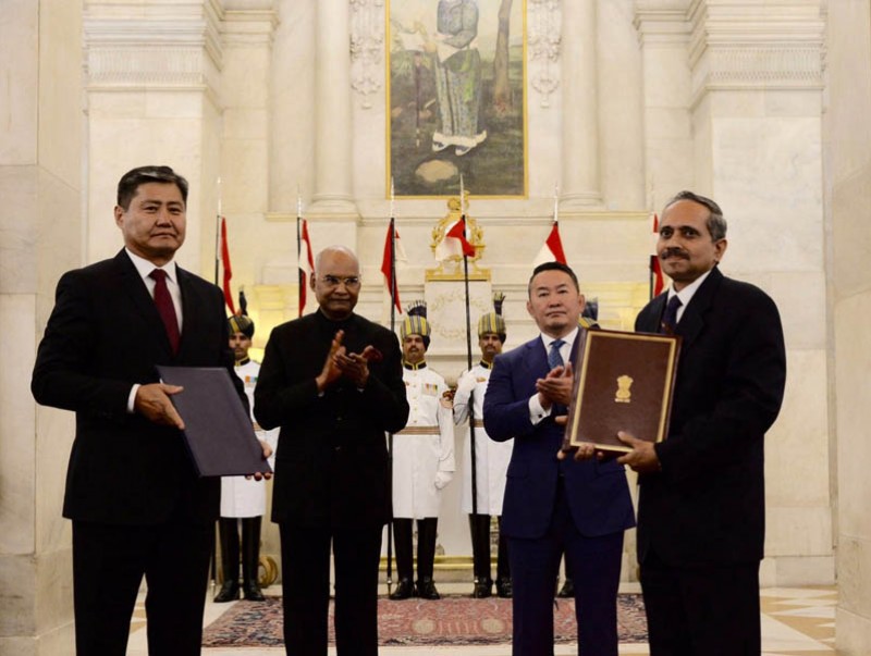 Монгол Улсын Ерөнхийлөгч Х.Баттулга, Бүгд Найрамдах Энэтхэг улсын Ерөнхийлөгч Нам Ратх Ковинд нарын уулзалтын дараа хоёр улсын Ерөнхийлөгч нарыг байлцуулан зарим баримт бичигт гарын үсэг зурах ёслол Энэтхэгийн Ерөнхийлөгчийн ордонд боллоо.
