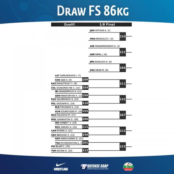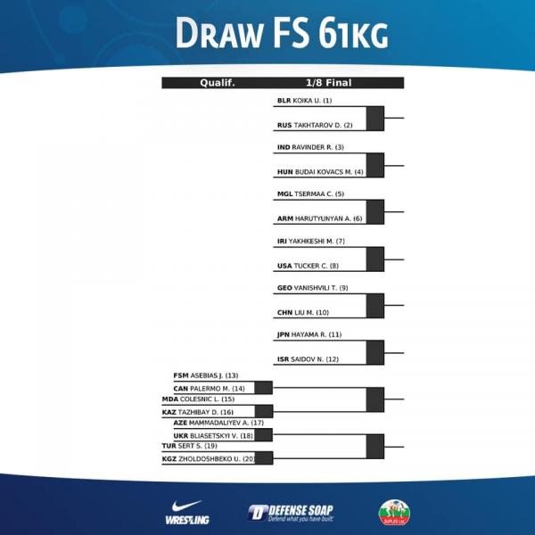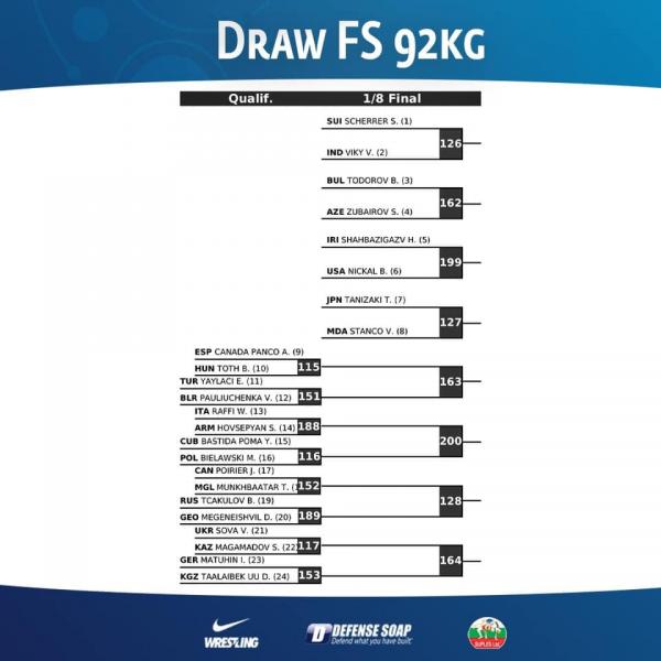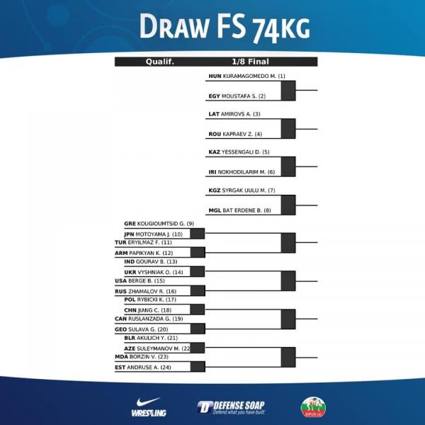 Эхний өдөр манай улсаас З.Занабазар (57 кг), Э.Тэмүүлэн (70 кг), Д.Батзул (79 кг) нарыг ялсан бөхчүүд манай цагаар 01:00 цагт өрсөлдөгчөө ялж шигшээд шалгарвал маргааш дагах барилдаан хийх юм.