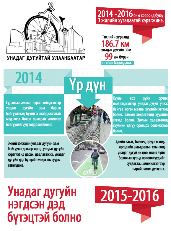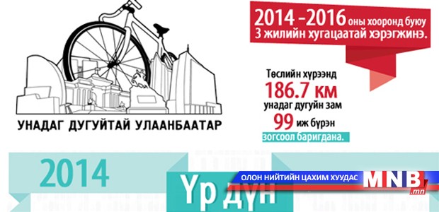 Монголын залуучуудын холбооны хэрэгжүүлж буй “Спорт уу, спирт үү” аян, “Залуучуудын чөлөөт цагийг хэрхэн зөв өнгөрөөх вэ” төслийн хүрээнд МЗХ, НЕТГ-ийн дэргэдэх “New image” клуб, “Залуу дугуйчин” клуб, Монголын авто замчин залуучуудын холбоо, "Canondale" дугуйн дэлгүүр, "Attila" дугуйн дэлгүүр, Монголын дугуйн холбоо, Монголын триатлоны холбоо зэрэг нэр бүхий есөн байгууллага хамтран “Унадаг дугуйтай Улаанбаатар” төслийг шинэчлэн боловсруулсан юм. “Унадаг дугуйтай Улаанбаатар” төсөл 2014-2016 оны буюу гурван жилийн хугацаанд 186.7 км унадаг дугуйн зам, 99 иж бүрэн зогсоол барих бөгөөд эхний ээлжинд нийслэлийн төсөвт тэрбум гаруй төгрөг суулгуулж, нийслэлийн ерөнхий төлөвлөгөөнд орж ажлаа эхлүүлэхээр болжээ.