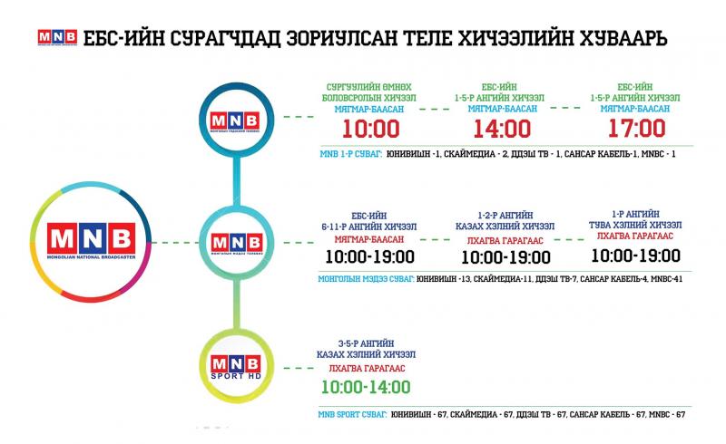Харин МҮОНТ 21 аймаг, 330 сум, бүх багт эфирээ хүргэдэг учир олон нийтийн өмнө хүлээсэн үүргийнхээ дагуу ирэх сарын 3-наас бүх ангийн хичээлийг гаргахаар бэлтгэл ажилдаа орсон. Тухайлбал, МҮОНРТ-ийн нэгдүгээр суваг буюу Үндэсний телевизээр сургуулийн өмнөх боловсрол, бага боловсрол буюу 1-5 дугаар ангиас гадна 12 дугаар ангийн хичээлийг үзэх боломжтой. Харин дунд, ахлах ангийн хичээлийг МҮОНРТ-ийн хоёрдугаар суваг буюу “Монголын мэдээ” суваг гаргана.