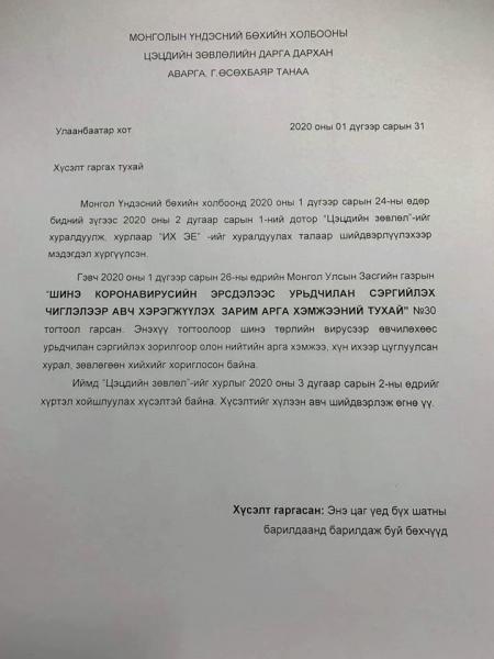 Уг хүсэлтэнд одоо дэгдээд буй шинэ коронавирусийн улмаас засгийн газрын гаргасан олон нийтийг хамарсан арга хэмжээг цуцлах тогтоолын дагуу “Цэцдийн хурал”-ыг ирэх гуравдугаар сарын 2 хүртэл хойшлуулж өгнө үү хэмээсэн байна.