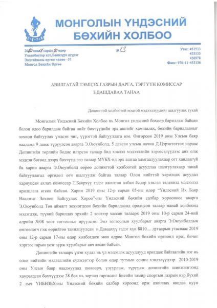 Энэхүү үйл ажиллагааг Цэцдийн зөвлөлийн дарга Г.Өсөхбаярт хариуцуулсан юм. Энэ үеэр Монголын үндэсний бөхийн бүх шатны барилдаанд барилдаж буй бөхчүүд холбоондоо хүсэлт гаргасан билээ.