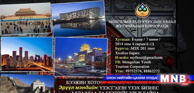 Монголын Залуучуудын Холбооны дэргэдэх “Аялал Жуулчлалын Корпораци” энэ жилийг “Бид Монголын залуусыг дэлхийгээр хөтөчлөнө” уриатайгаар бүхий л аялалаа зохион байгуулж байгаа. Энэ хүрээнд 4-р сарын 6-13-ны хооронд БНХАУ-ын Бээжин хотод зохиогдож буй 16-дахь удаагийн “Эрүүл мэнд, эмнэлгийн тоног төхөөрөмж, эм тарианы эрүүл ахуйн үзэсгэлэн” үзэх анхны аялалаа зохион байгууллаа.