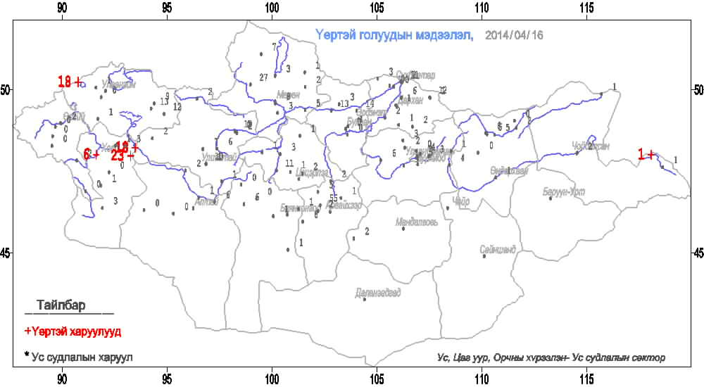 2014 оны 4 дүгээр сарын 16-ны өдрийн байдлаар урин дулаан цаг ирж буйтай уялдан голын сав газрын цас, мөс эрчимтэй хайлж голын гулдрилд нийлж, мөсөн дээгүүр их хэмжээний ус гүйх , цөнгийн хахаа үүсч усны урсгал шахагдсан зэргээс шалтгаалан Их хянганы нуруунаас эхтэй Халх гол Ялалт баг орчимд болон Хангай нурууны өврийн Тээл, Хомын хоолой, Алтай нуруунаас усжих Буянт гол Ховд орчимд үерийн түвшинг 5-20 см давсан байдалтай байна. Иймд дээрх голуудын сав газраар нутаглаж буй малчид, ард иргэдийг сонор сэрэмжтэй байхыг зөвлөж байна. Цаашид цаг агаар дулаарч байгаатай холбогдон мөсөн бүрхүүл задрах, шар усны үер хаврын цөнтэй зэрэгцэн ажиглагдах тулмөс цөмрөх болон шар усны үерийн аюулаас болгоомжтой байхыг анхааруулж байна.