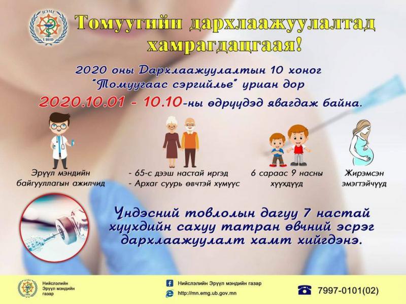 Томуу болон сахуу татран өвчний эсрэг вакцинаар дархлаажуулах ажлыг нийслэл болон хөдөө орон нутагт 2020 оны аравдугаар сарын 01-нээс 10-ны хооронд зохион байгуулж байна.