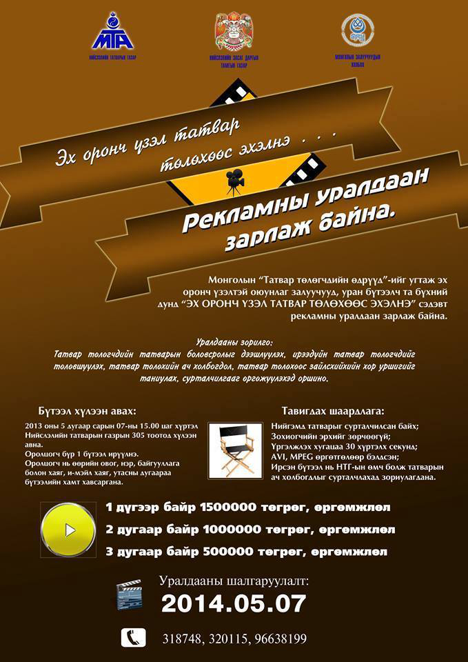 Уралдаанд тавигдах шаардлага нийгэмд татварыг сурталчилсан байх, зохиогчийн эрхийг зөрчөөгүй, үргэлжлэх хугацаа 30 секунд хүртэлх, AVI, MPEG өргөтгөлөөр бэлдсэн, ирсэн бүтээл нь НТГ-ын өмч болж татварын ач холбогдлыг сурталчлахад зориулагдах ажээ. Бүтээлийг ирэх тавдугаар сарын 2-ны 16.00 цаг хүртэл Нийслэлийн татварын газрын 305 тоотод хүлээн авах бөгөөд ирэх сарын 5-ны өдөр НТГ-ын Татвар төлөгчдөд үйлчлэх хэлтэс МЗХ-ны хамтарсан комисс шалгаруулах юм. Уралдааны нэгдүгээр байр Өргөмжлөл 1.500.000 төгрөг, хоёрдугаар байр Өргөмжлөл 1.000.000 төгрөг, гуравдугаар байр Өргөмжлөл 500.000 төгрөгийн шагналын сантай юм байна.