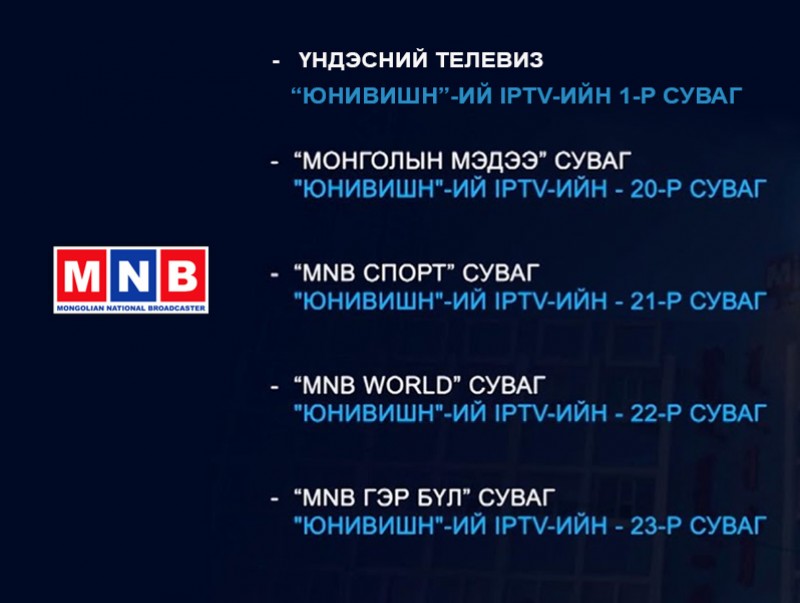 ЦАГИЙН ХҮРД: Өнөөдрөөс /2021.03.01/ МҮОНРТ-ийн "Монголын Мэдээ" суваг "Юнивишн"-ий IPTV-ийн 20 дугаар сувгаар үзэгчдэд хүрэхээр боллоо. Мөн МҮОНРТ-ийн "MNB Спорт" суваг "Юнивишн"-ий 21 дүгээр сувгаар, "MNB World" суваг 22 дугаар сувгаар, "MNB Гэр бүл" суваг 23 дугаар сувгаар тус тус үзэгчдэд хүрэхээр боллоо.
