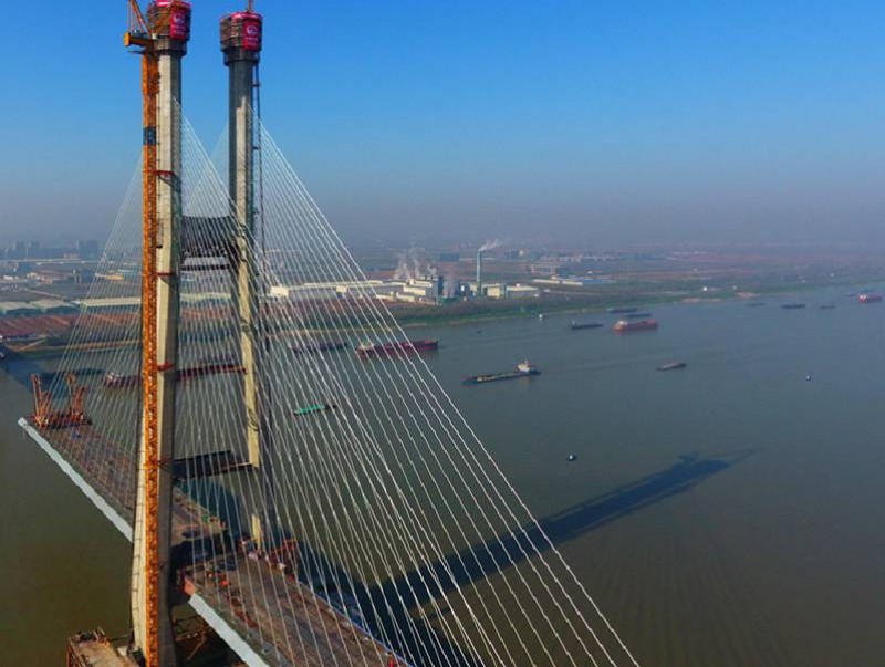 Урд хөрш Хүбэй болон Жянсү мужийн Хөх мөрнөөр зааглагдаг хоёр хотыг холбосон гүүрний гол тулгуур баганыг өчигдөр барьж дууссан талаар CCTV мэдээлэв. Энэ баганатай холбогдсон олон тооны дүүжин төмөр тросс бүхий