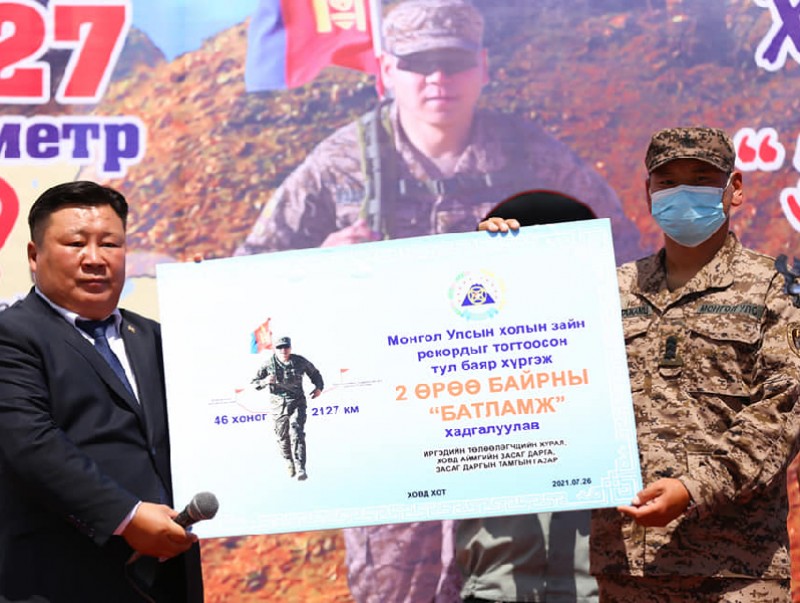 Хатанбаатар Магсаржавын нэрэмжит, Цэргийн гавьяаны улаан тугийн одонт, Зэвсэгт хүчний 123 дугаар ангийн хөгжимчин, ахлах ахлагч Э.Даваажамц Монголын баруун хязгаар Ховд аймгийн Ард Аюушийн талбайгаас Монгол төрийн далбаагаа үүрээд хэт холын зайн гүйлтийг өнгөрсөн зургаадугаар сарын 2-нд эхлүүлж, эх орны зүүн хязгаар Дорнод аймаг хүртэл 2127 км замыг 46 хоногт туулж Монголын хэт холын зайн гүйлтийн рекордыг шинэчлэн тогтоосон билээ.