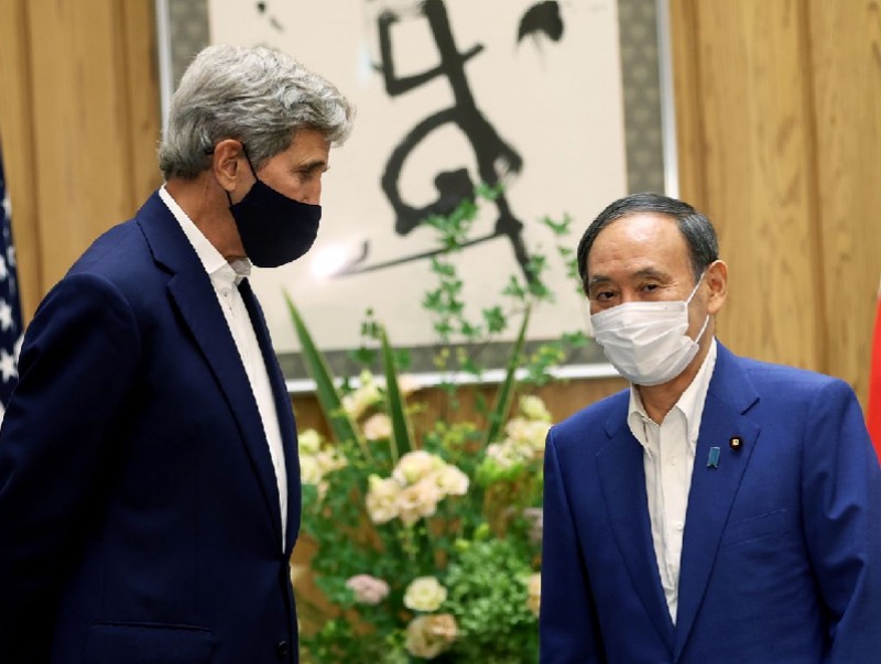 Мөн тэрбээр Япон улсын 2030 он гэхэд хүлэмжийн хийн ялгарлаа эрс танах төлөвлөгөөг Жон Керрид тайлбарласан байна. Үүний хариуд Жон Керри Америкийн Ерөнхийлөгч Жозеф Байдены засаг захиргаа уур амьсгалын өөрчлөлттэй хэрхэн тэмцэж байгаа талаар ярилцжээ. Өнгөрсөн 4 дүгээр сард АНУ-ын Ерөнхийлөгч Жозеф Байден, Японы Ерөнхий сайд Суга Ёшихидэ нар уур амьсгалын өөрчлөлтийн улмаас учирч буй аюул, заналхийллийн эсрэг тэмцэх түншлэлийг бий болгохоор санал нэгдсэн юм.