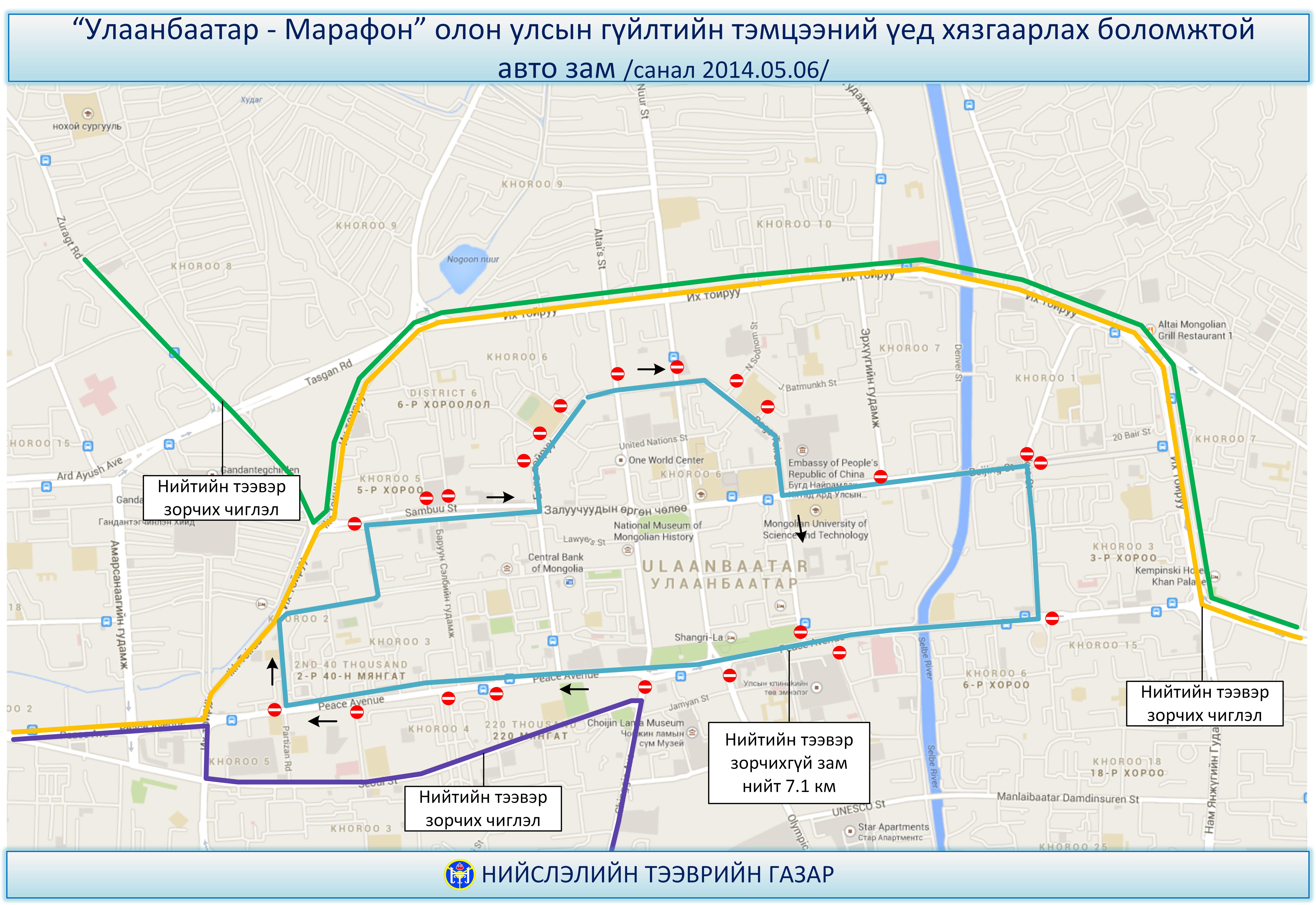 06 дугаар сарын 7-ны өдөр болох “Автомашингүй өдөр”, “Улаанбаатар марафон” олон улсын гүйлтийн тэмцээний үеэр 08-17 цагт Энхтайваны өргөн чөлөө буюу Зүүн дөрвөн замаас Баруун дөрвөн зам, Гэсэр сүмийн уулзвараас Сансарын тунел дотогш автомашингүй бүс болгож, замын хөдөлгөөнийг хаана. Энэ үеэр нийтийн тээврийн үйлчилгээний үндсэн чиглэлийн 37, хот орчмын 6 чиглэлд өөрчлөлт орж байгаа юм. Нийтийн тээврийн үйлчилгээ амралтын өдрийн хуваарийн дагуу үйлчлэх бөгөөд Баруун дөрвөн замаас Зүүн дөрвөн зам, Нарны зам, Их тойруугаар тойрч явахаар маршрут гаргалаа.